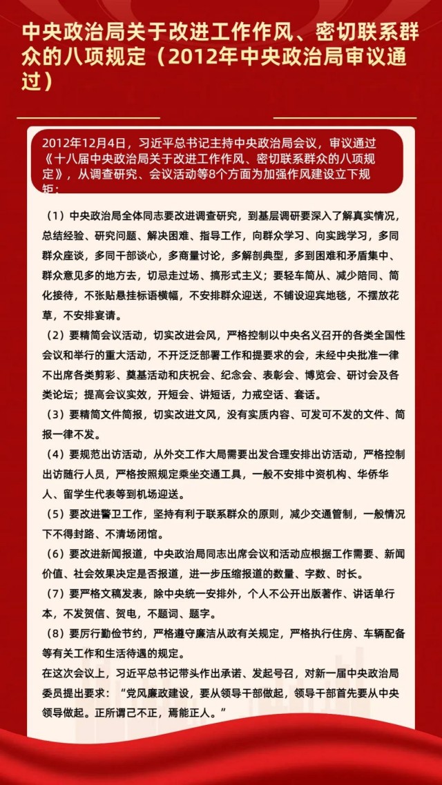 黨的作風(fēng)就是黨的形象,關(guān)系人心向背,決定黨和國(guó)家事業(yè)成敗。黨的十八大以來(lái),以習(xí)近平同志為核心的黨中央從制定和落實(shí)中央八項(xiàng)規(guī)定開局破題,堅(jiān)持自上而下、以上率下,解決了新形勢(shì)下作風(fēng)建設(shè)抓什么、怎么抓的問(wèn)題。八項(xiàng)規(guī)定一子落地,作風(fēng)建設(shè)滿盤皆活,黨風(fēng)政風(fēng)煥然一新,社風(fēng)民風(fēng)持續(xù)向好,我們黨以作風(fēng)建設(shè)新氣象贏得了人民群眾信任擁護(hù)。